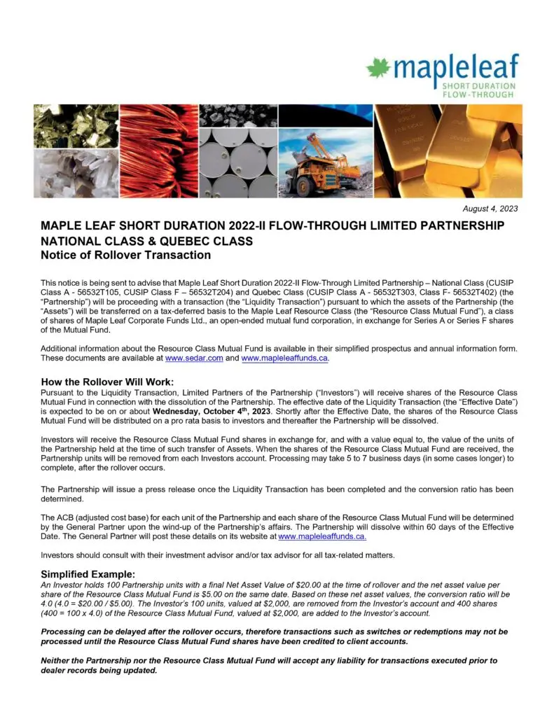 Notice of Rollover – Maple Leaf Short Duration 2022-II Flow-Through Limited Partnership – National Class & Quebec ClassBy Emily / August 4, 2023