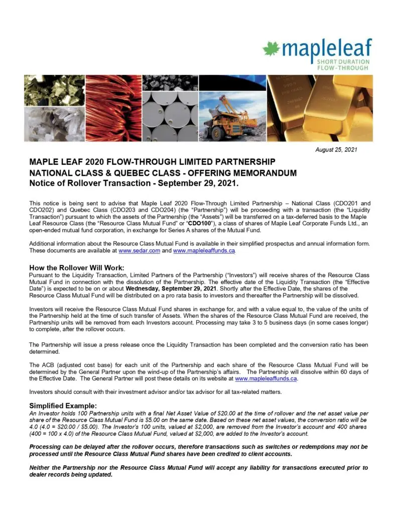 Notice of Rollover Transaction – Maple Leaf 2020 Flow-Through LP (National & Quebec Class)By Emily / August 25, 2021