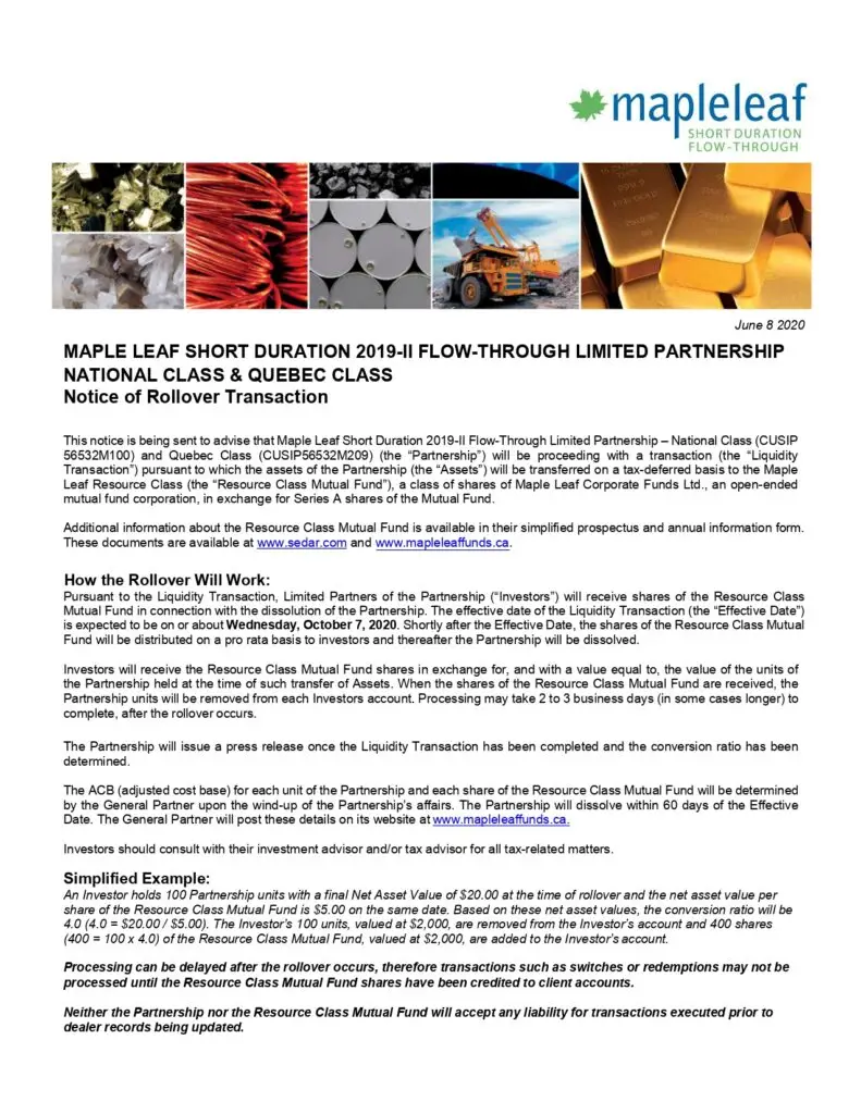 Notice of Rollover Transaction – Maple Leaf Short Duration 2019-II Flow-Through LP (National & Quebec Class)By Emily / June 8, 2020